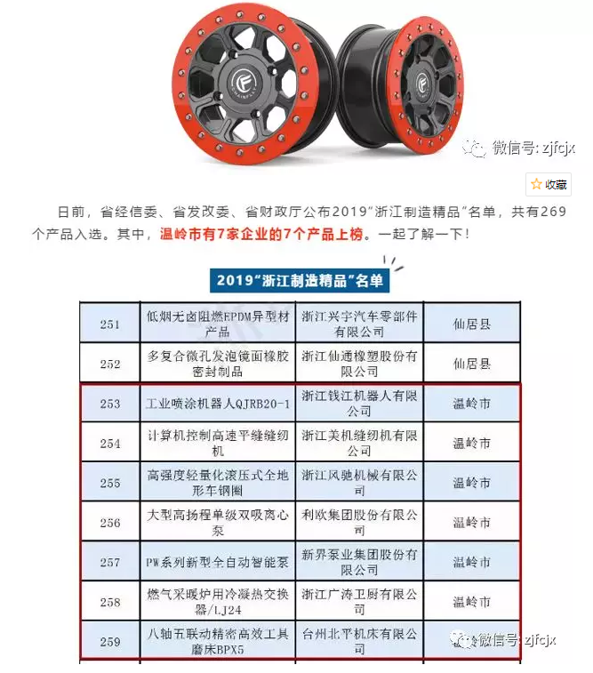 為全面提升“浙江制造”品牌形象,深入推進實施“四換三名”工程,推動企業(yè)提升創(chuàng)新能力、品牌培育和市場開拓力度,扶持并推廣應(yīng)用一批“技術(shù)先進、設(shè)計新穎、質(zhì)量可靠、效益優(yōu)良”的浙江制造產(chǎn)品,公司響應(yīng)風(fēng)馳于2019響應(yīng)政府號召積極參與“浙江制造精品”申報,通過省經(jīng)信委、省發(fā)改委、省財經(jīng)廳聯(lián)合開展評選,風(fēng)馳的《高強度輕量化滾壓式全地形車鋼圈》上榜入選為2019“浙江制造精品”名單,同時根據(jù)市政府鼓勵企業(yè)開發(fā)新產(chǎn)品的規(guī)定,公司將予以獲得30萬元的獎勵。